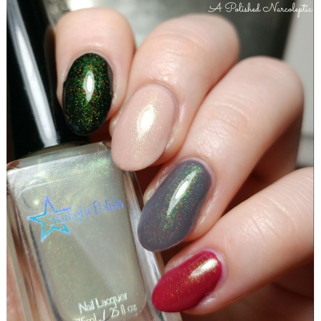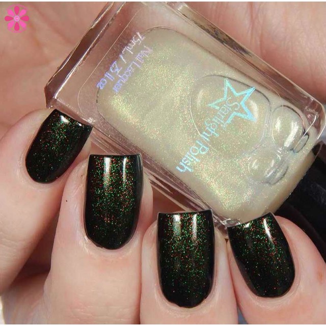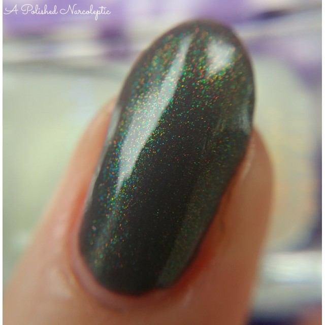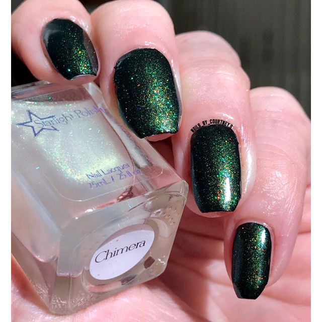 Prior to the introduction of Kelpie to the Mythological line, a customer requested a blend of the three existing Mythological top coats (Phoenix, Dragon, and Unicorn), and named that resulting top coat Uniphoedra.  That polish gave rise to the Chimera polishes - as chimera is the term used for a mythical hybrid creature composed of parts of other creatures, it seemed appropriate for a pigment blend that is a combination of four Mythological creatures. Just like each of the creatures in the Mythological line is tied to a specific pigment, a Chimera polish will contain the four color shifting pigments used in Starlight and Sparkles' Phoenix, Dragon, Unicorn, and Kelpie polishes.