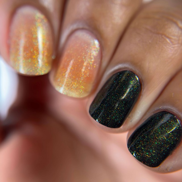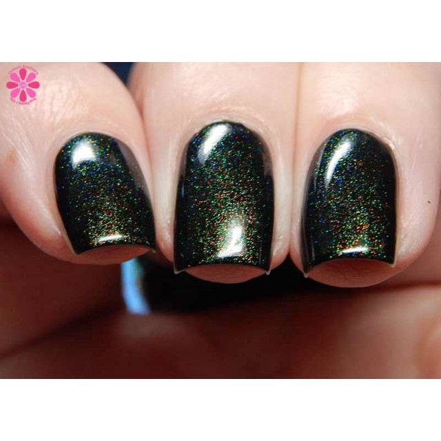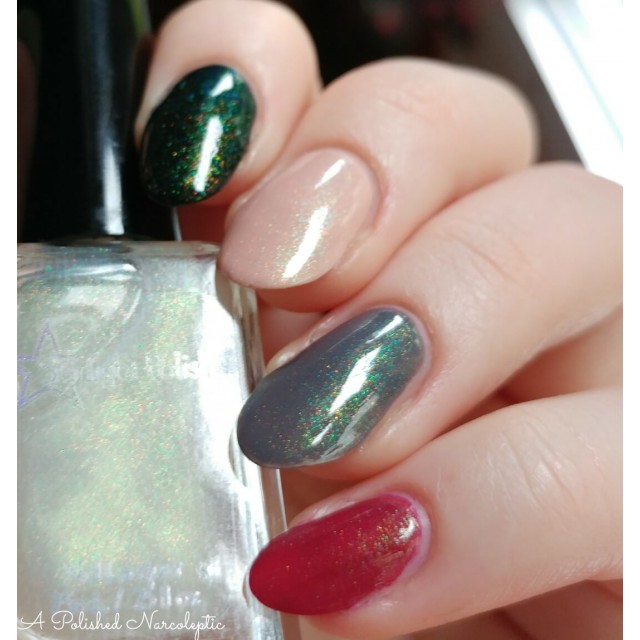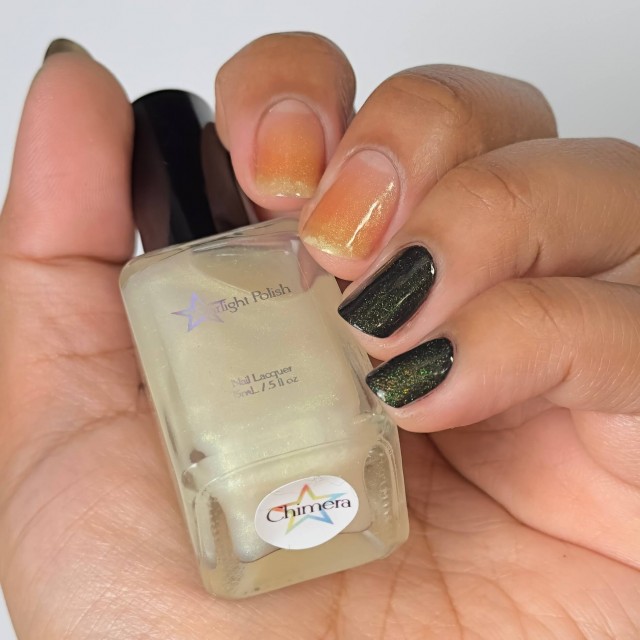The color shifting pigments in the Chimera polishes are a combination of the four pigments used in four of the other "creature" types of Mythological polishes (Phoenix, Dragon, Unicorn, and Kelpie). These pigments can produce different ranges of color shift, from the red to green of "unicorn pee" pigment to the gold to green, green to blue, and teal to violet of "unicorn pee sibling" pigments.