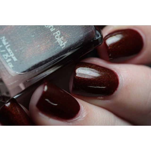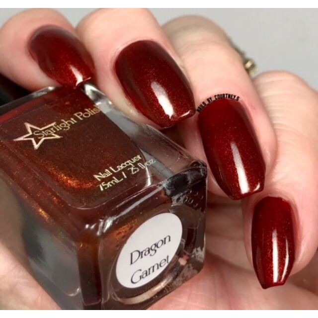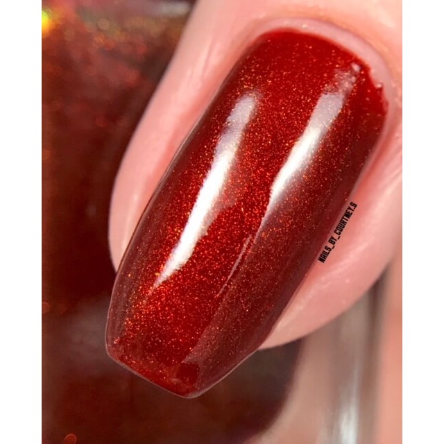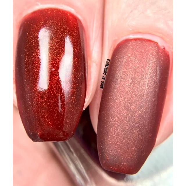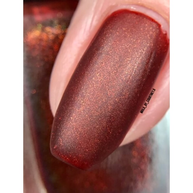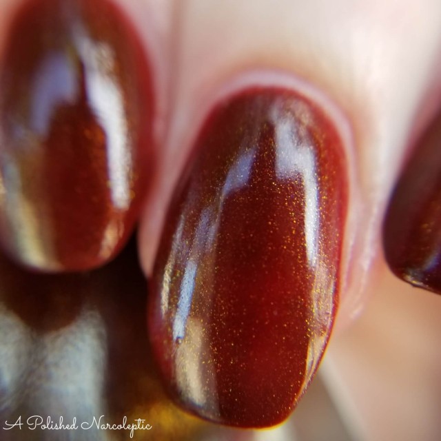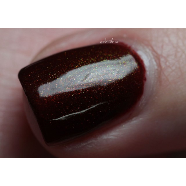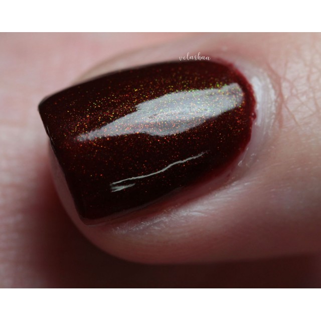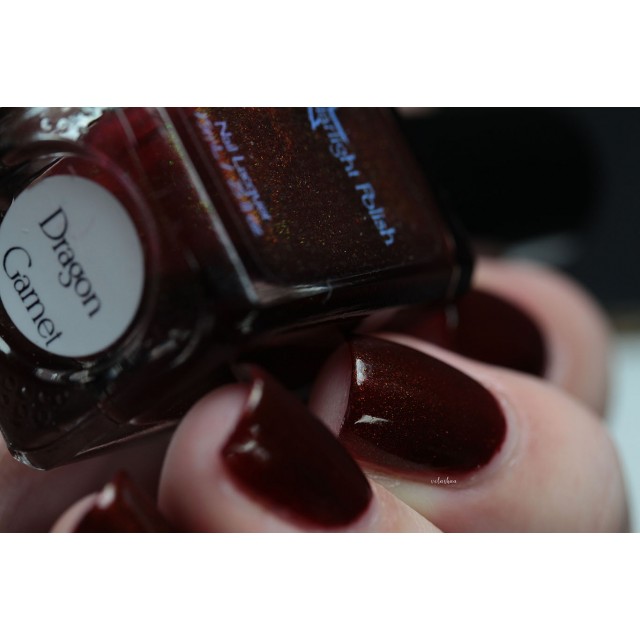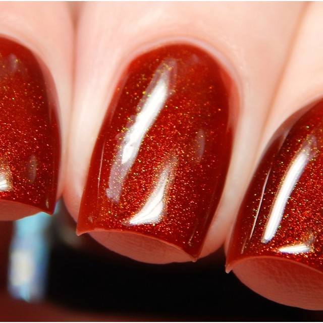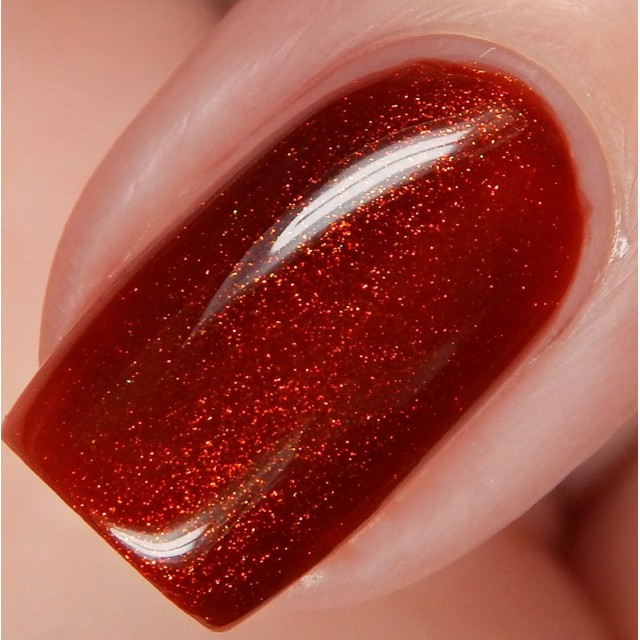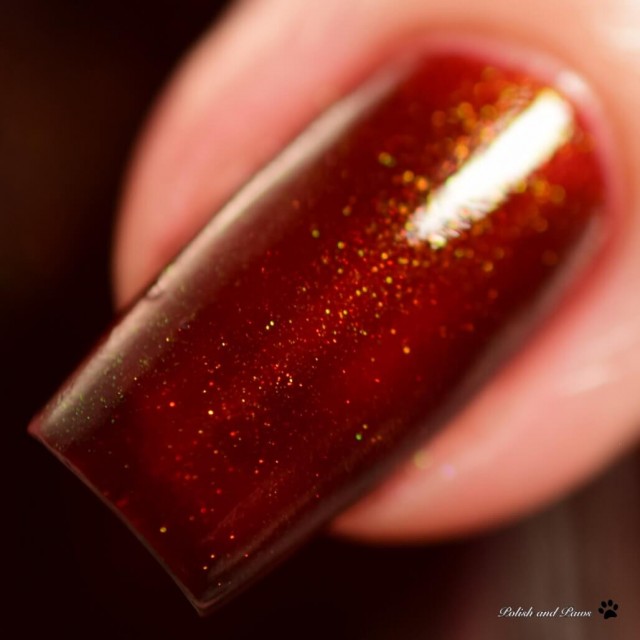 Dragon Garnet is a color shifting shimmer nail polish. It is a dark red jelly base with shimmer that shifts from bronze gold to green, and flashes orange and teal at the extremes of its color range.