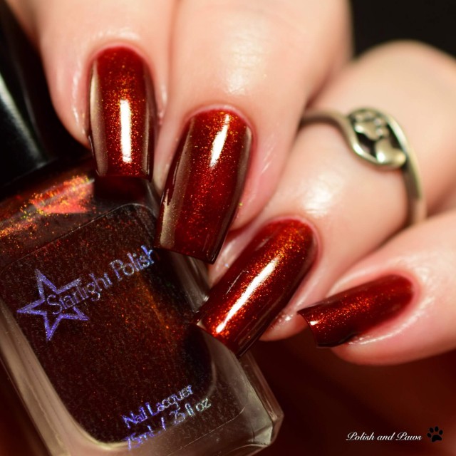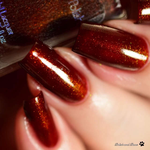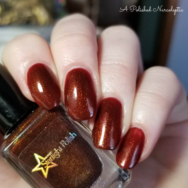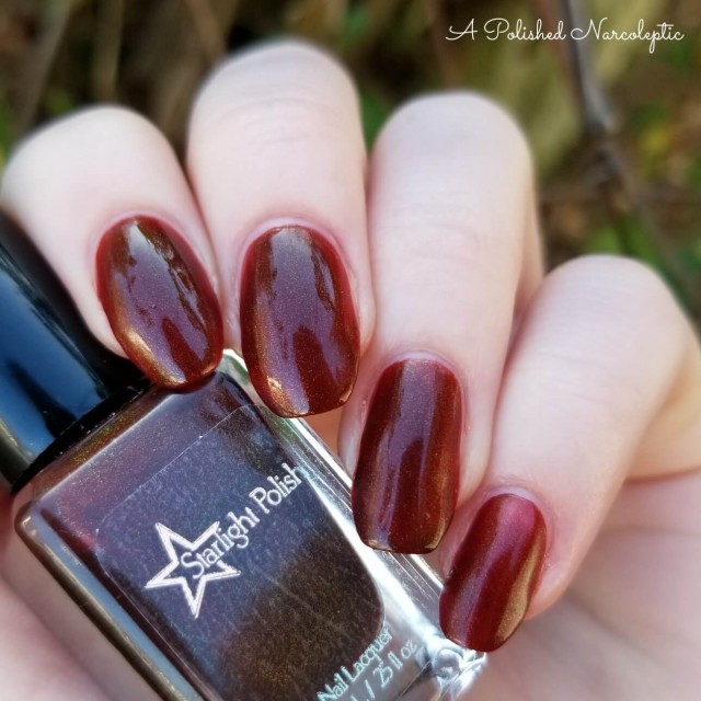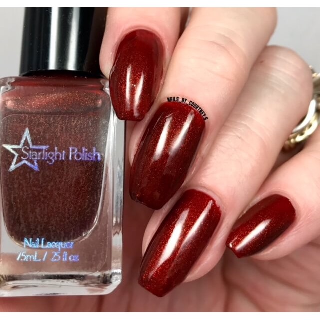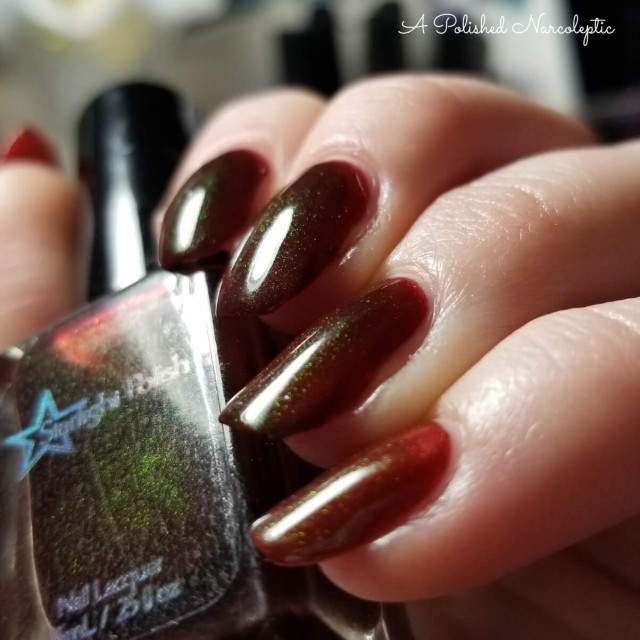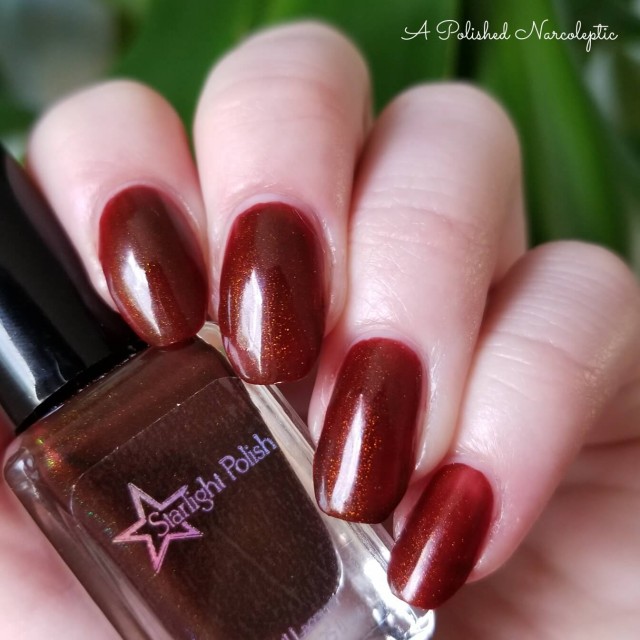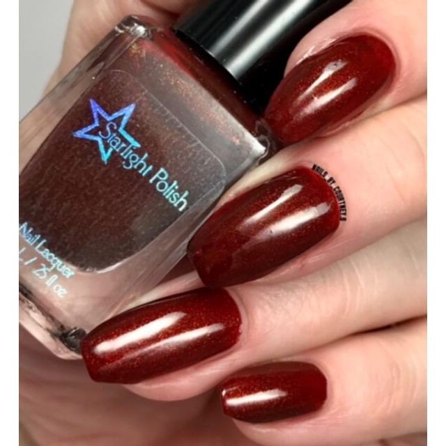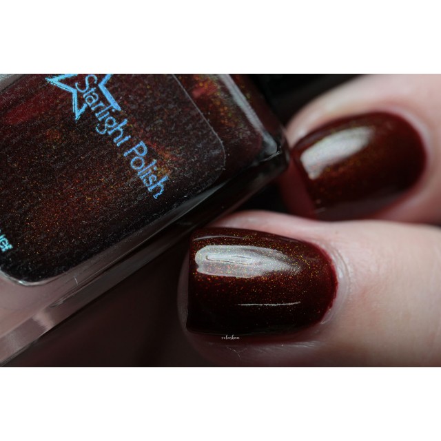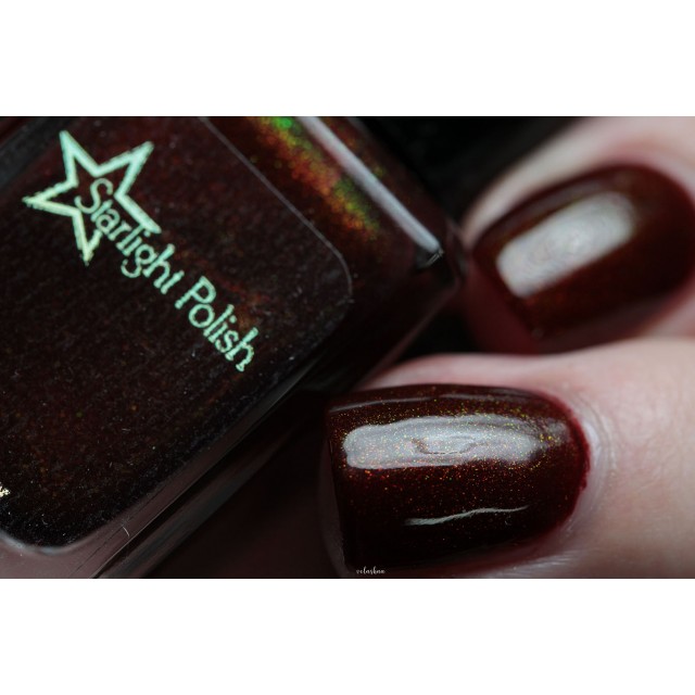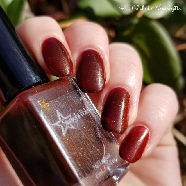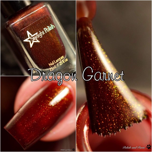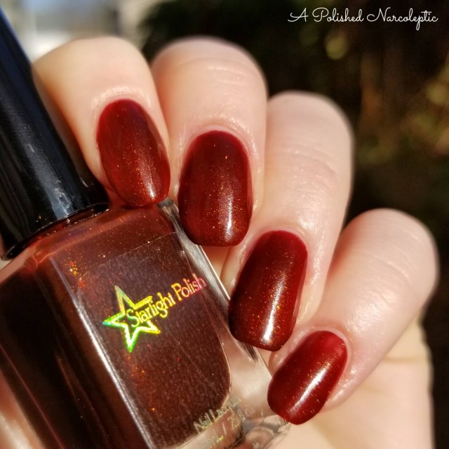 Dragon Garnet is a color shifting shimmer nail polish. It is a dark red jelly base with shimmer that shifts from bronze gold to green, and flashes orange and teal at the extremes of its color range.