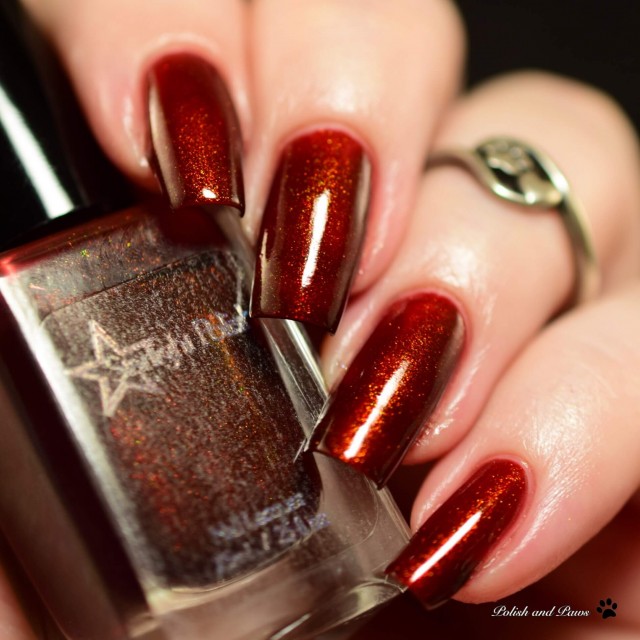 This polish is part of the Mythological Gems collection, a series within the Mythological line that offers four of the different colors of Mythological pigments (Phoenix, Dragon, Unicorn, and Kelpie) in the same base color. The Garnet base color is based on, and named for, dark red garnets (which are usually almandine or pyrope garnets).