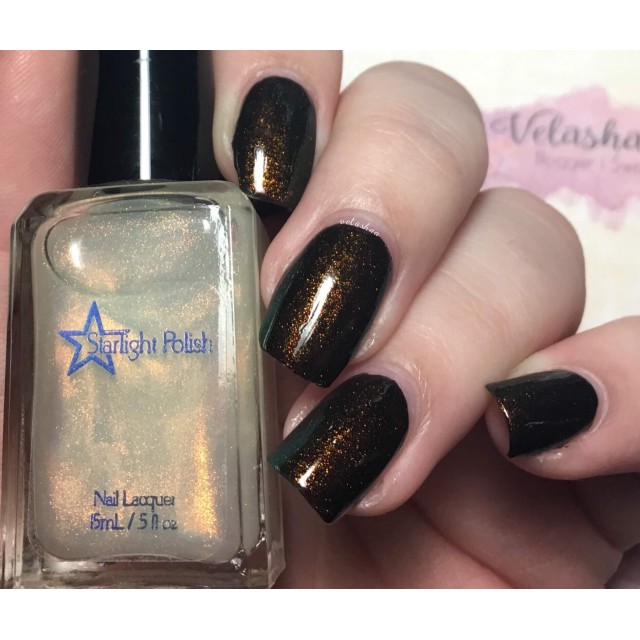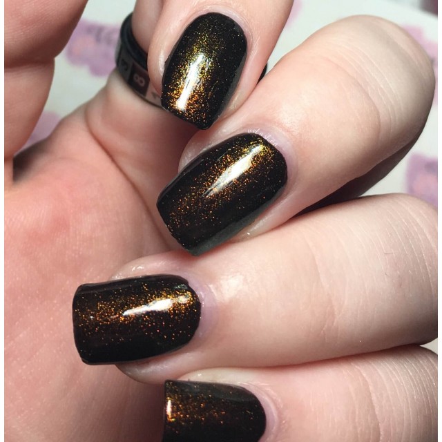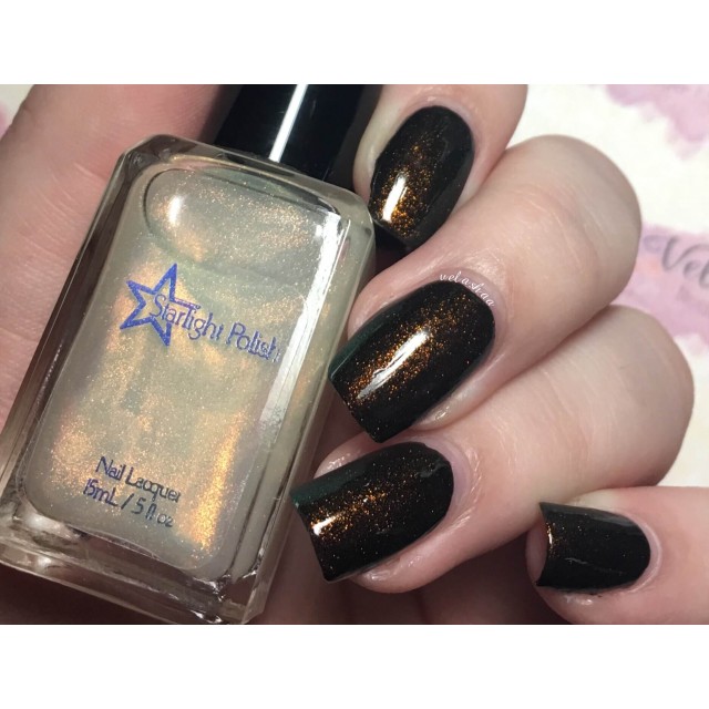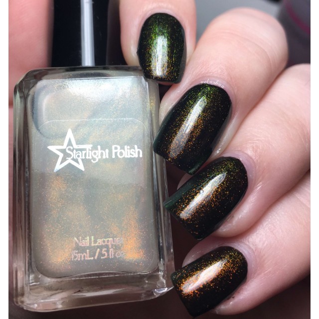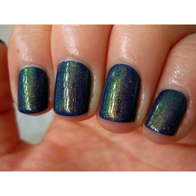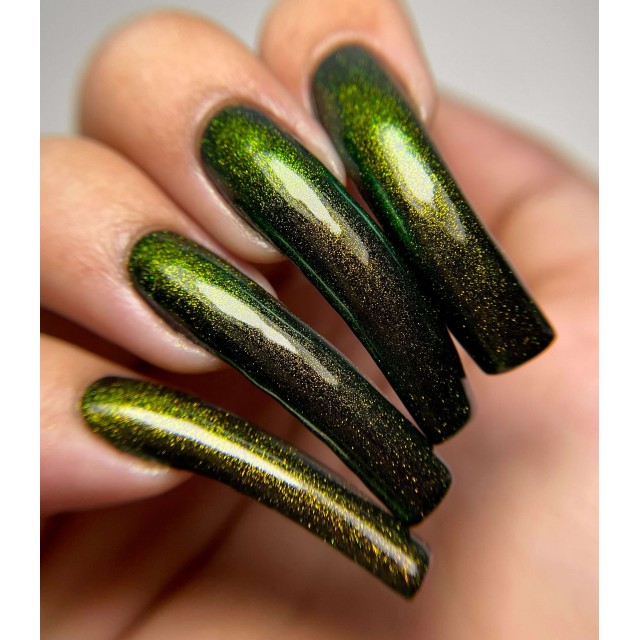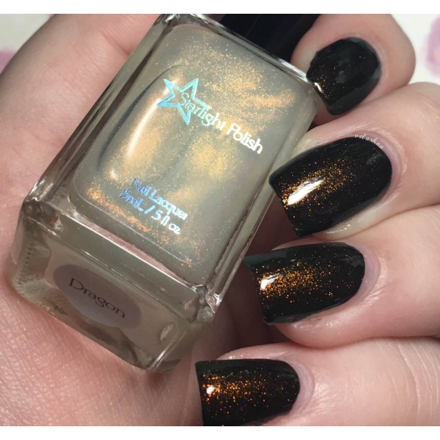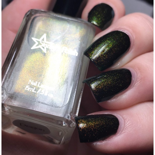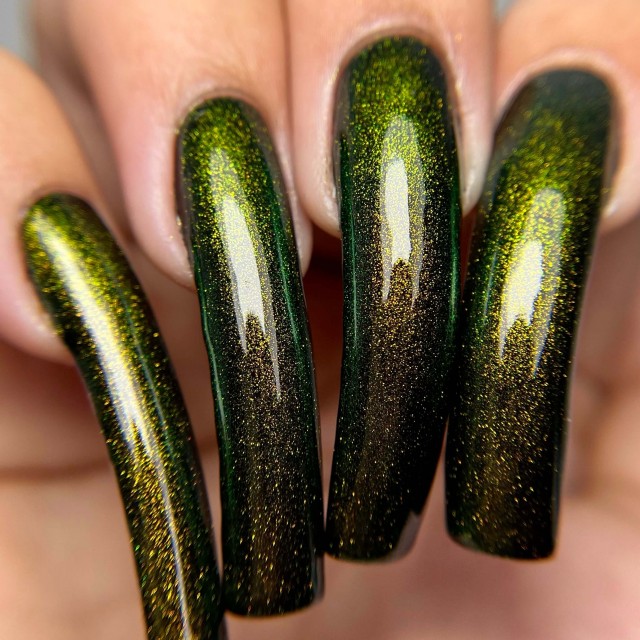 This polish contains a "unicorn pee sibling" pigment, which are pigments of the same sort as "unicorn pee" but with different color shifts. The gold to green color shifting pigment in the Dragon polishes is the same kind of pigment that's in the original elusive Liquid Euphoria polishes with gold to green shifting shimmer.
