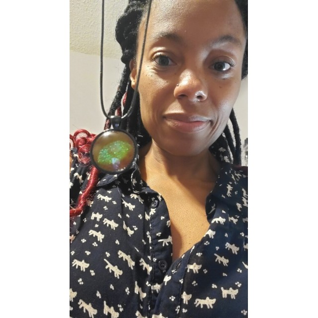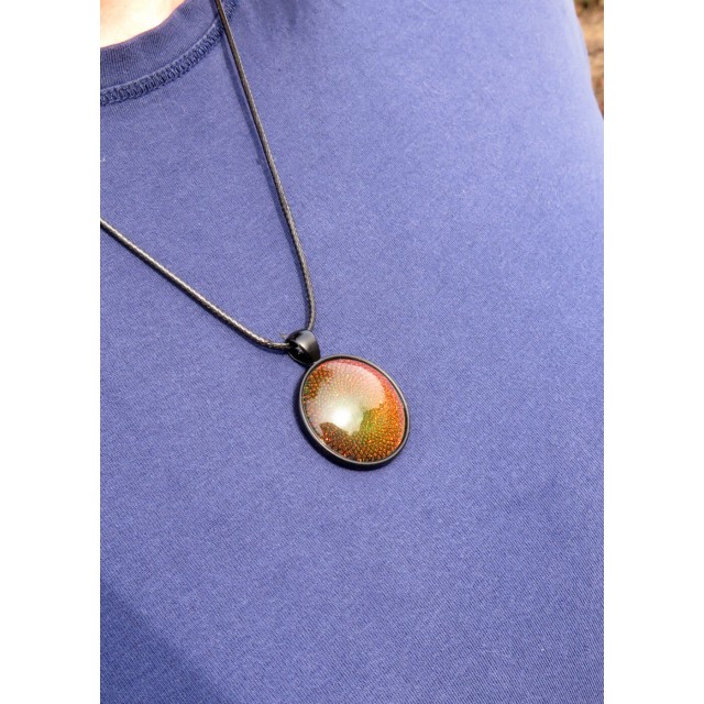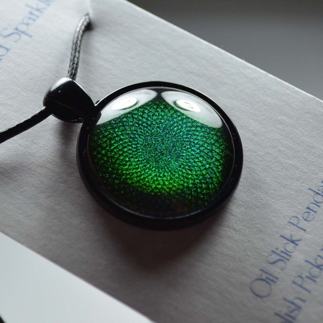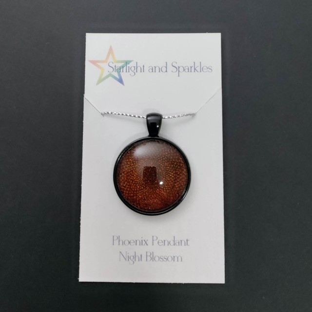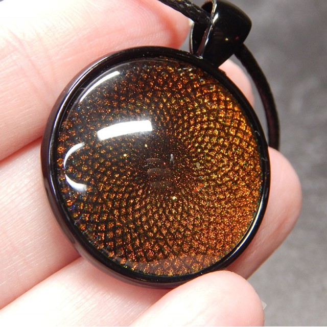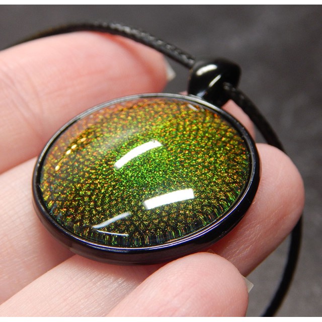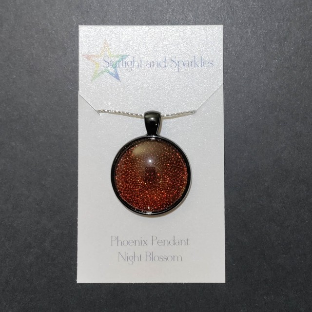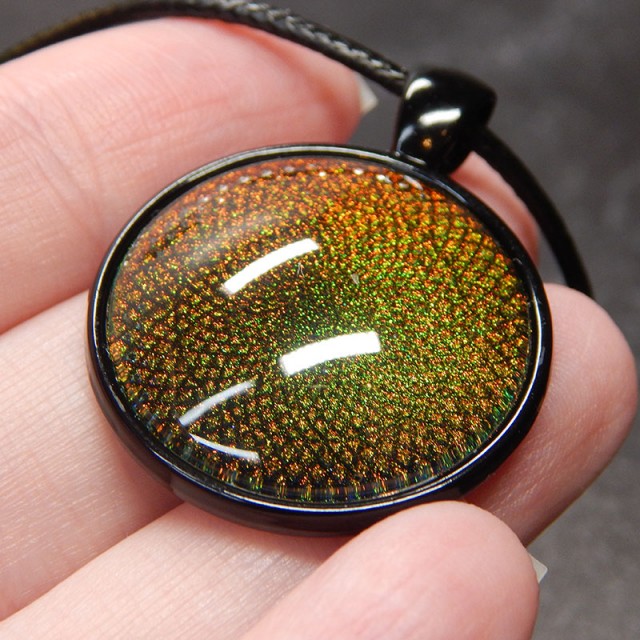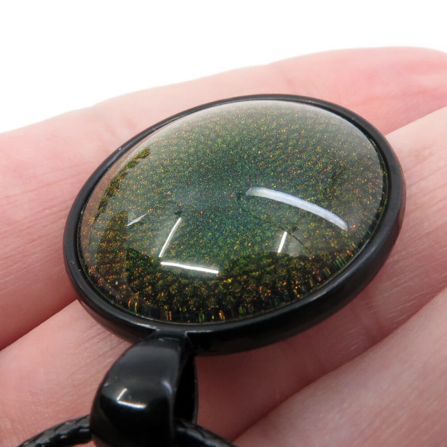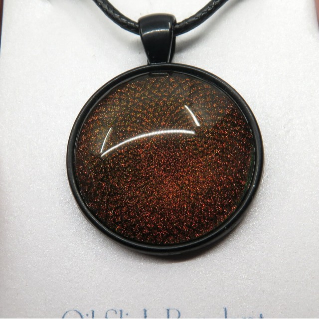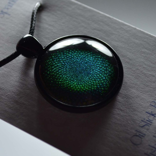 Phoenix Pendant: Night Blossom uses a black pendant tray and a glass cabochon, and showcases the beautiful rainbow colors of red to green shifting unicorn pee pigment, the same pigment used in our Phoenix polishes. The pendant shifts from fiery crimson to vivid green to beautiful almost-indigo blue at extreme angles. The outline of the same overlapping spiral/criss-cross pattern that is on the back of the pendants shows through the shimmer, resulting in an effect like scales or petals.