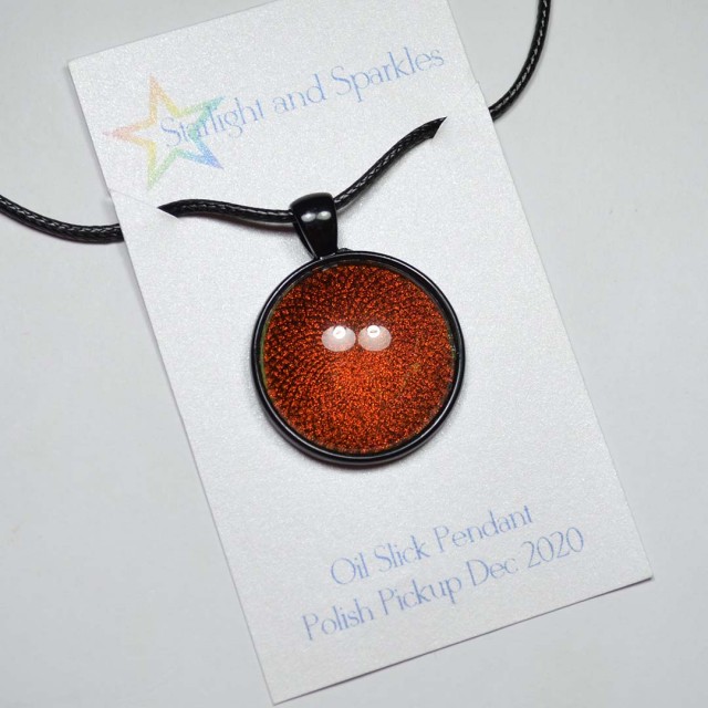 This pendant was originally released during December 2020's Polish Pickup as the Oil Slick pendant. These pendants (with or without necklace) will come on a card (similar to the cards used during the Polish Pickup release), with the new name of the pendant instead of the previous name.