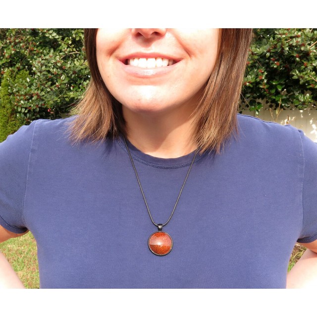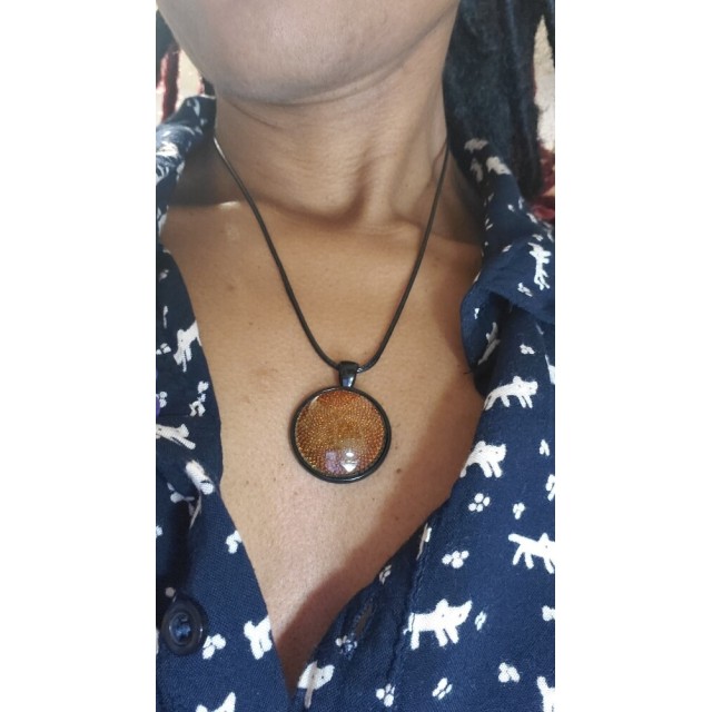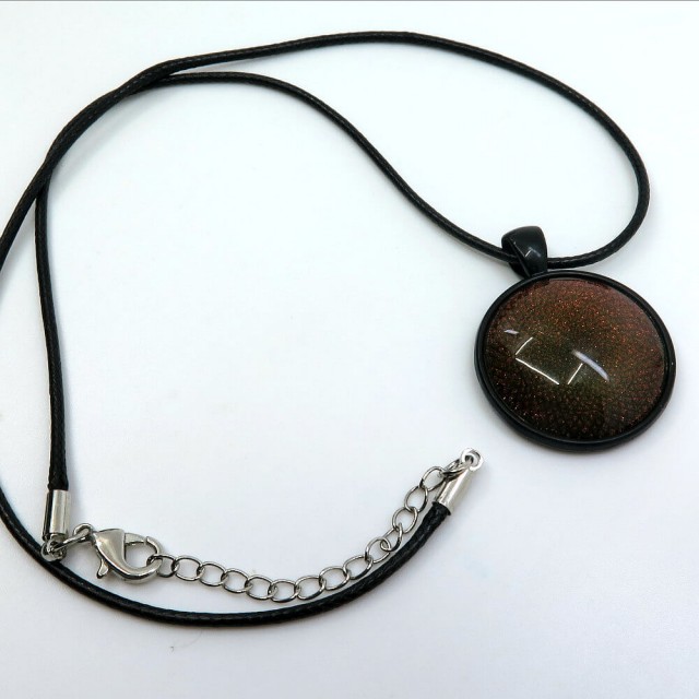 The glass cabochon is 1" (25mm). The pendant itself is 1.1" (28mm) wide and 1.4" (35mm) tall, including the loop at the top. The interior width of the loop is approximately .17" (4.5mm). The pendant will come on a card, and can be ordered alone or on an 18” black cord necklace with nickel free findings and extender chain.