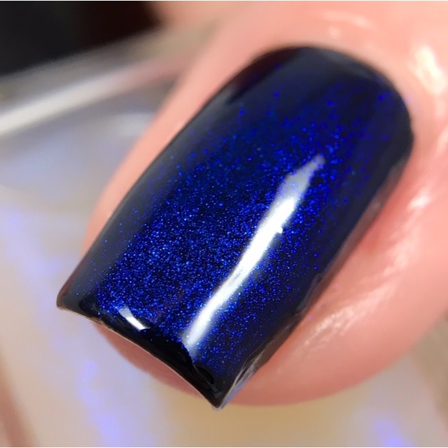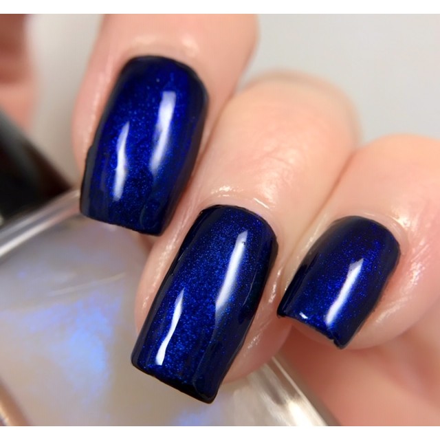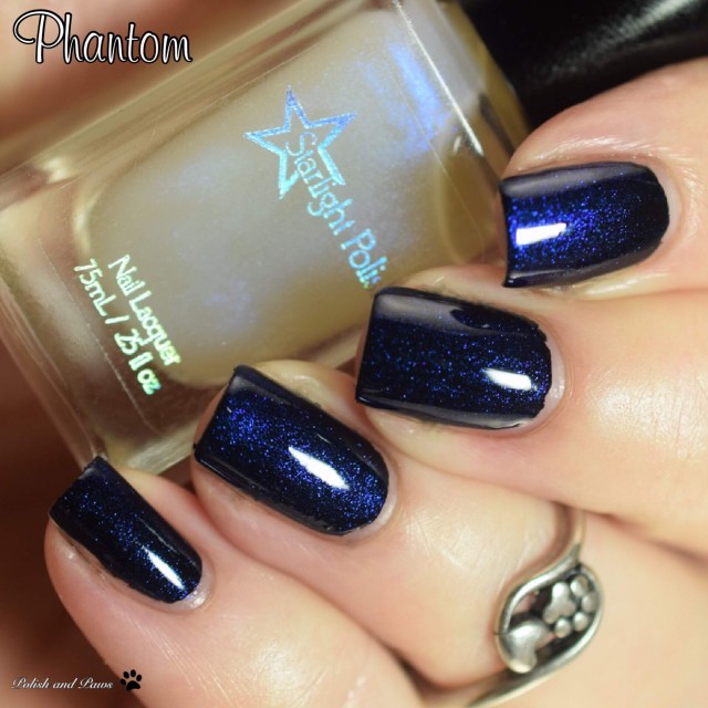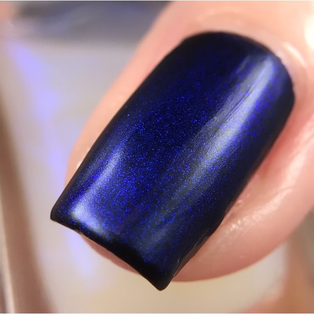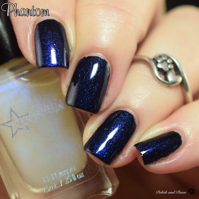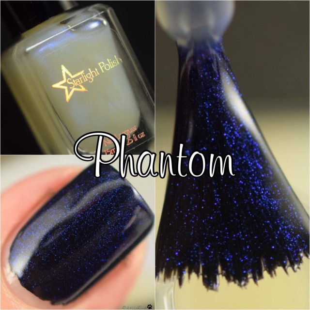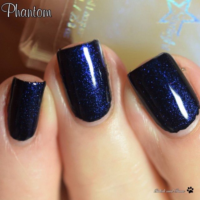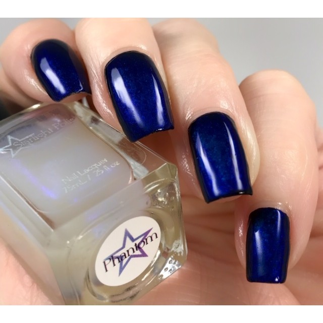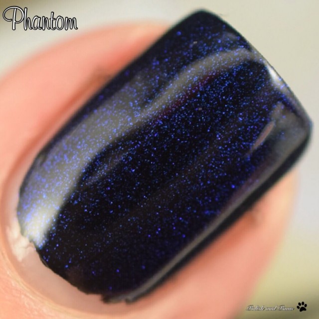 Phantom is a color shifting duochrome shimmer top coat, meant for layering over other polishes. Phantom shifts from a brilliant blue to violet to purple, and to near invisibility.