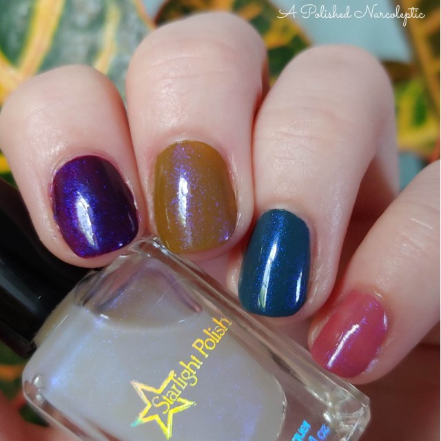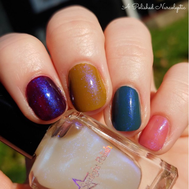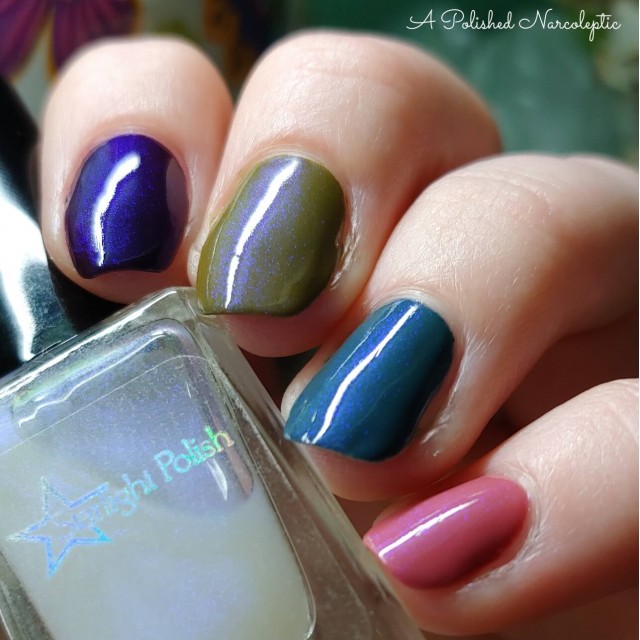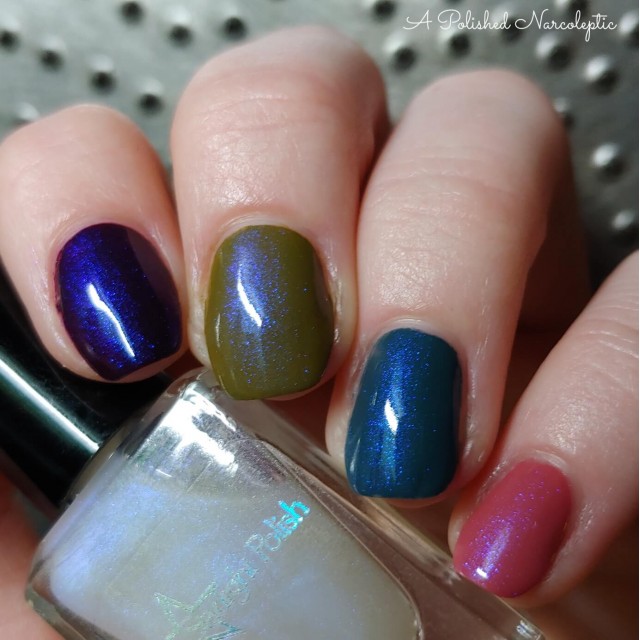 This polish contains a "unicorn pee sibling" pigment, which are pigments of the same sort as "unicorn pee" but with different color shifts.
