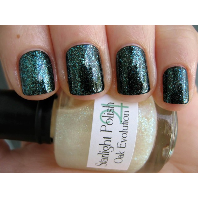 Oak Evolution is a shimmering glass fleck style top coat, meant for layering over other polishes. It is translucent flecks of shimmer that shine cool green.