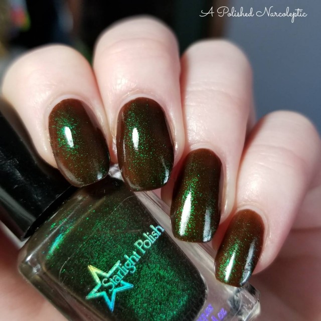 This polish is part of the Mythological Gems collection, a series within the Mythological line that offers four of the different colors of Mythological pigments (Phoenix, Dragon, Unicorn, and Kelpie) in the same base color. The Dravite base color is based on, and named for, the stone dravite, which is brown tourmaline.