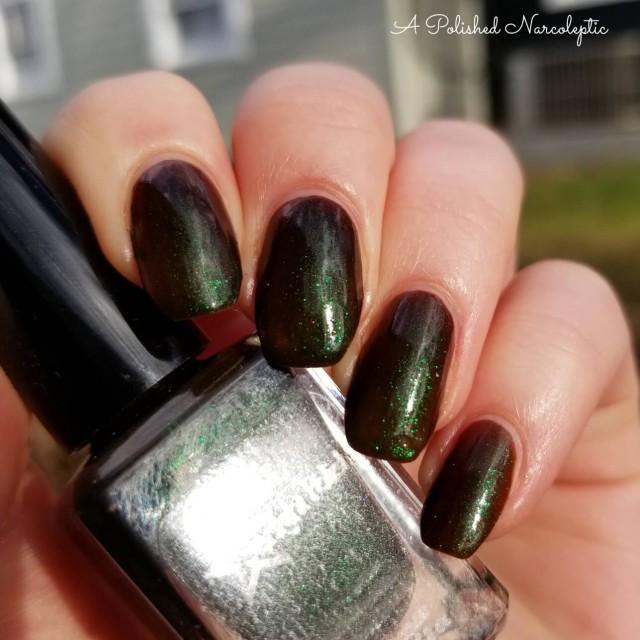 This polish contains a "unicorn pee sibling" pigment, which are pigments of the same sort as "unicorn pee" but with different color shifts. The green to blue color shifting pigment in the Unicorn polishes is the same kind of pigment that's in the original elusive Liquid Euphoria polishes with green to blue shifting shimmer.
