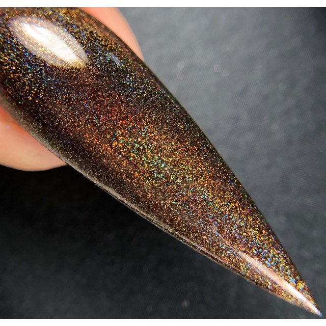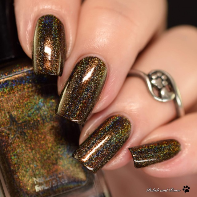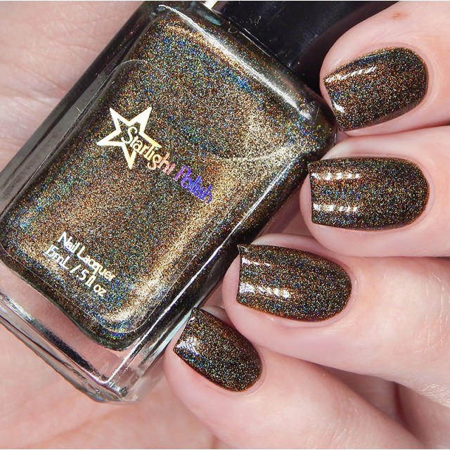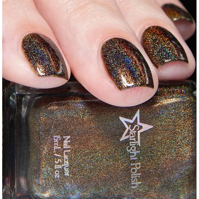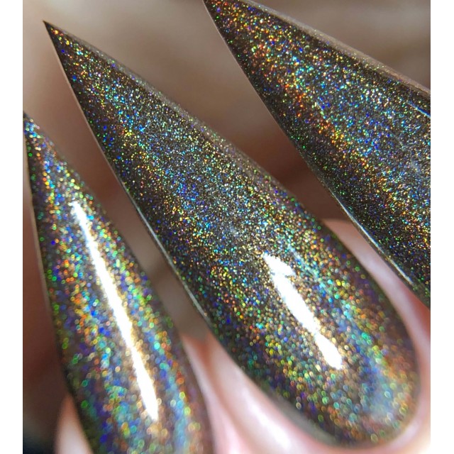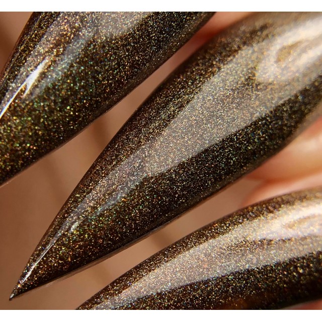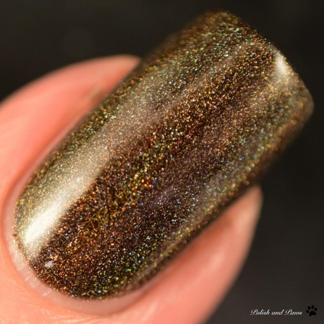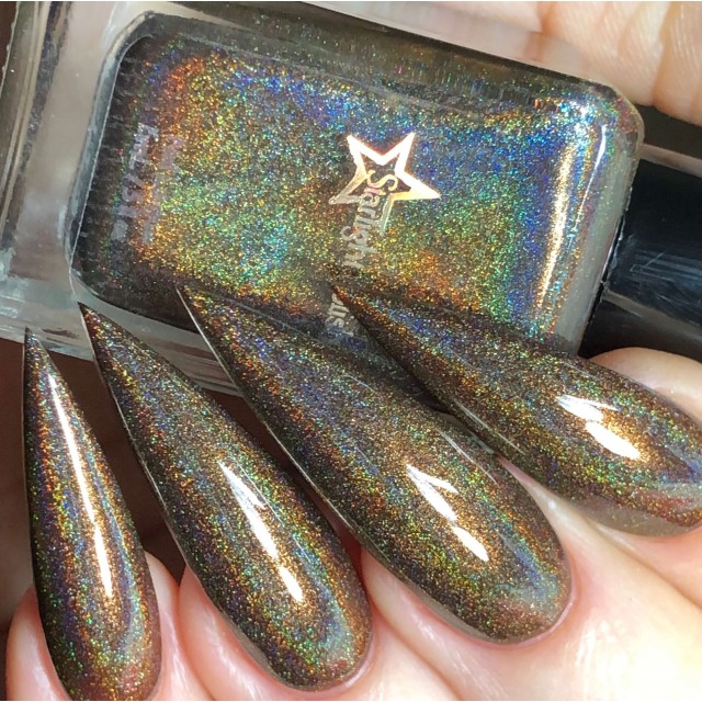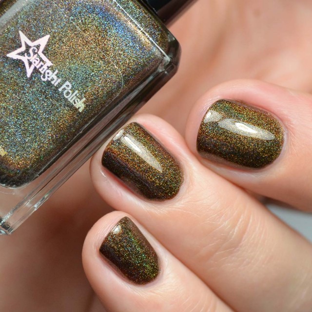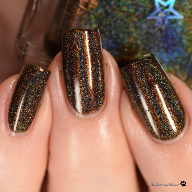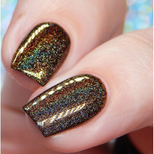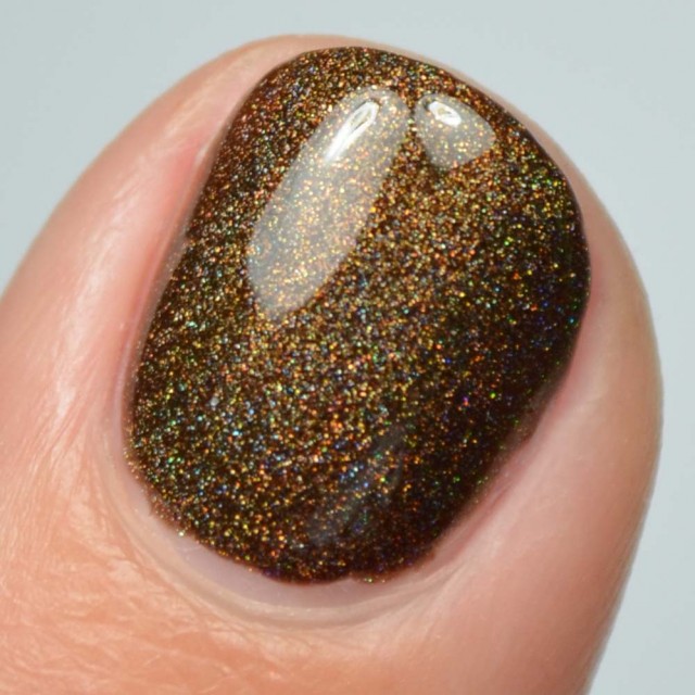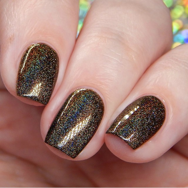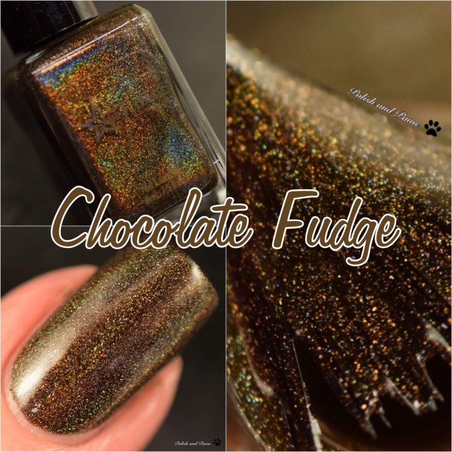 Chocolate Fudge is a rich brown holographic polish, and is opaque in approximately two coats. It’s named for fudge, chocolate fudge specifically! A base coat is recommended with this polish, as it is highly pigmented and highly pigmented polishes can stain.