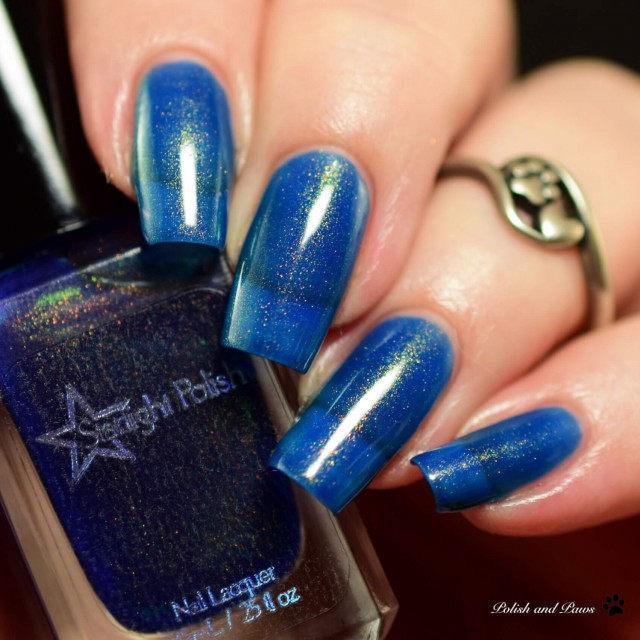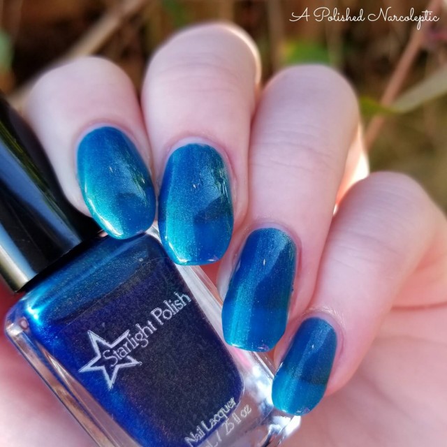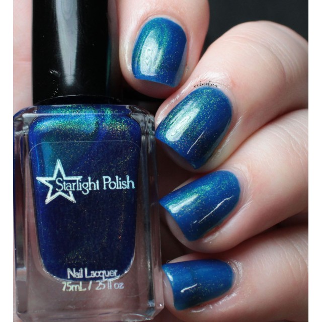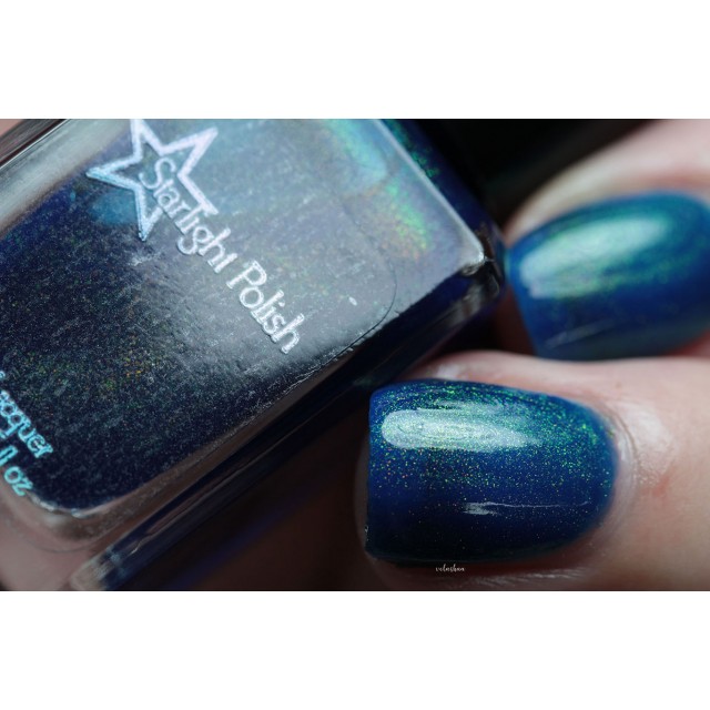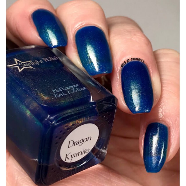 This polish is part of the Mythological Gems collection, a series within the Mythological line that offers four of the different colors of Mythological pigments (Phoenix, Dragon, Unicorn, and Kelpie) in the same base color.  The Kyanite base in is named after kyanite, a stone that occurs most frequently in shades of blue. The base color for Kyanite is a tweaked version of the base originally developed for Autumn Air, a custom polish created with Phoenix pigment. The customer who commissioned Autumn Air kindly gave permission to add the color to the Starlight Polish line!