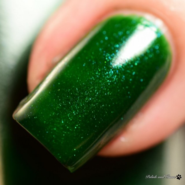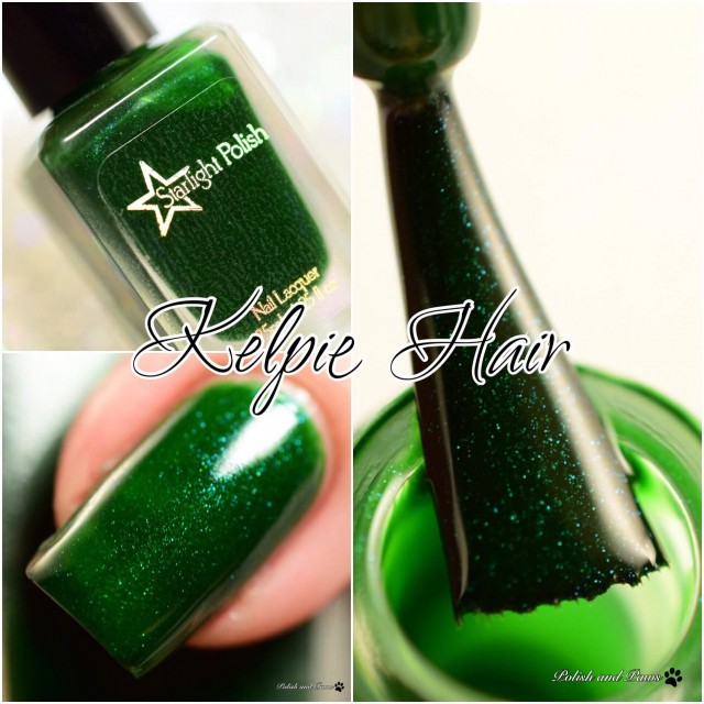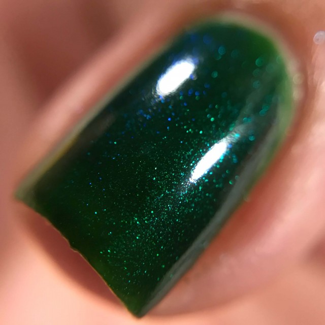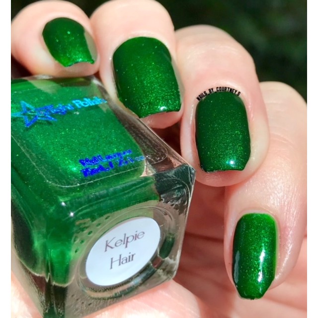 Kelpie Hair is a color shifting duochrome shimmer nail polish. It is a yellow-toned green that deepens with each coat, with shimmer that shifts from teal to violet, and flashes aqua and purple at the extremes of its color range.