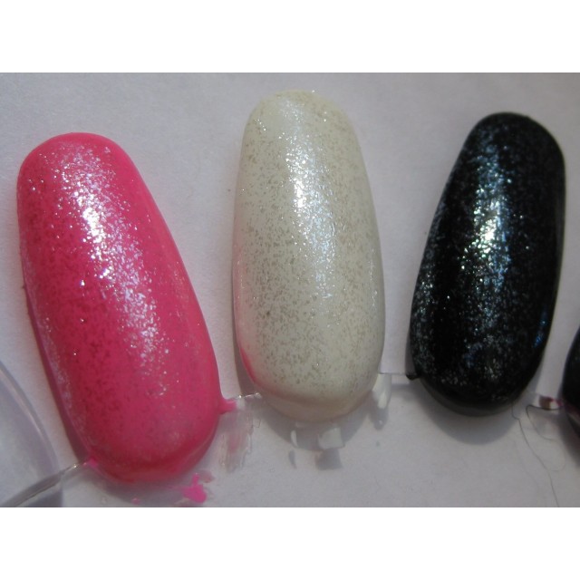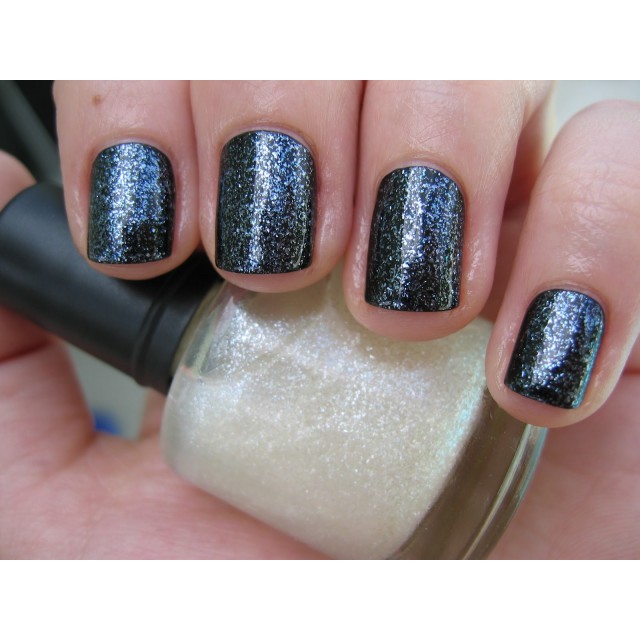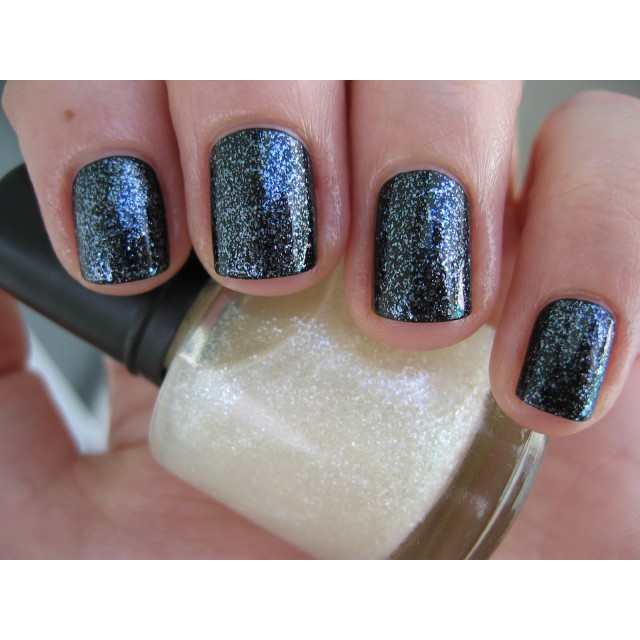 Silver Moon Crystal is a shimmering glass fleck style top coat, meant for layering over other polishes. It is translucent flecks of shimmer that shine silvery white. I think of it as a sugary looking sparkle.