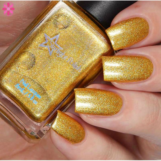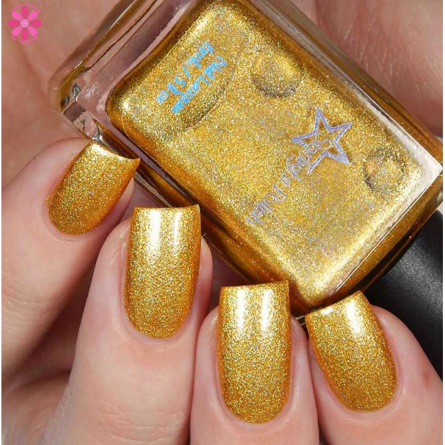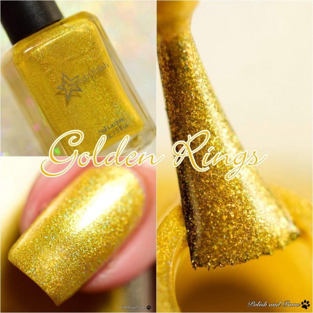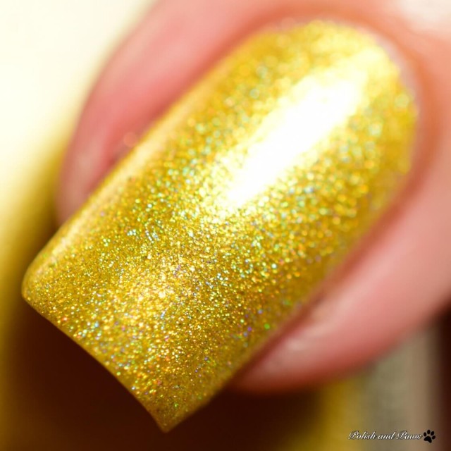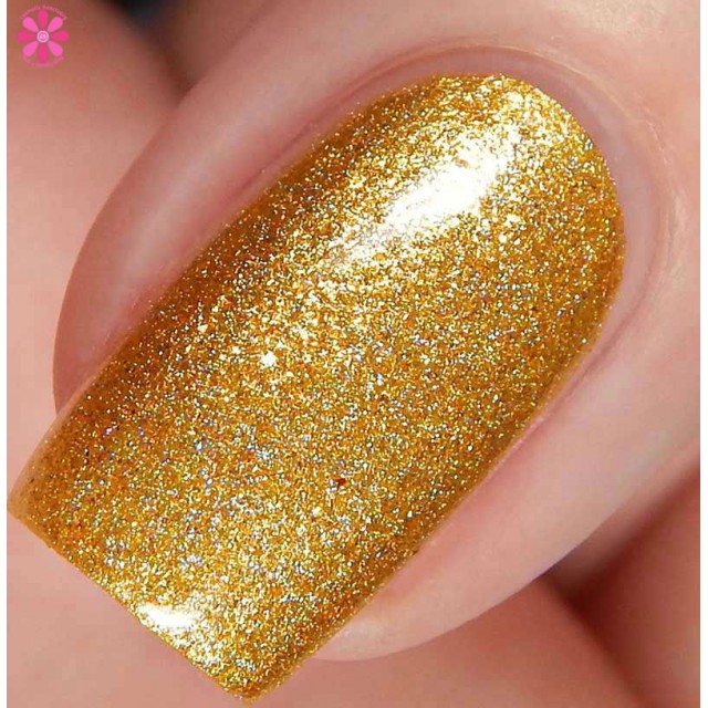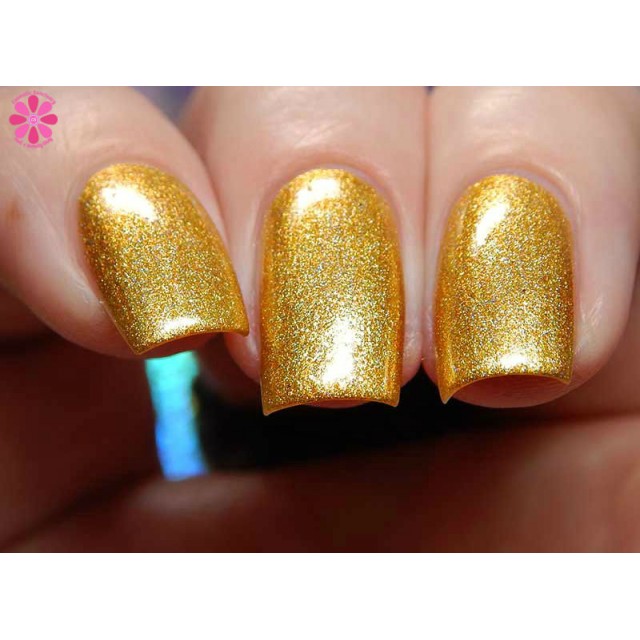Golden Rings is a shimmering gold holographic polish, and is opaque in approximately two to three coats. The holographic effect in this polish is dispersed, and has the weakest holographic effect of the polishes in the Winter Holodays collection. It has a very diffuse linear holographic effect. In dim light where normal holographic polishes wouldn't show the holographic effect, Golden Rings is still a lovely shimmery gold. Golden Rings is named for a few things - golden holiday decorations, the five golden rings from the song The Twelve Days of Christmas, and a tendency for people to propose during the winter holidays! A base coat is recommended with this polish, as it is highly pigmented and highly pigmented polishes can stain.