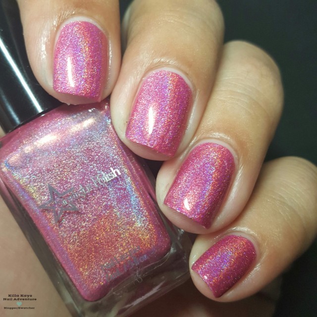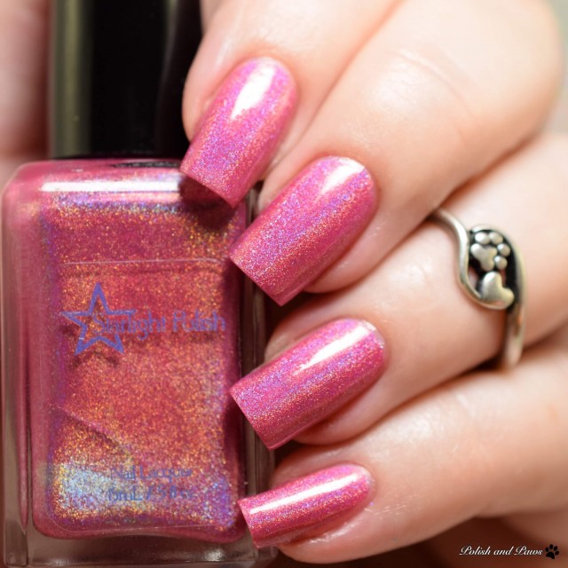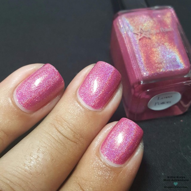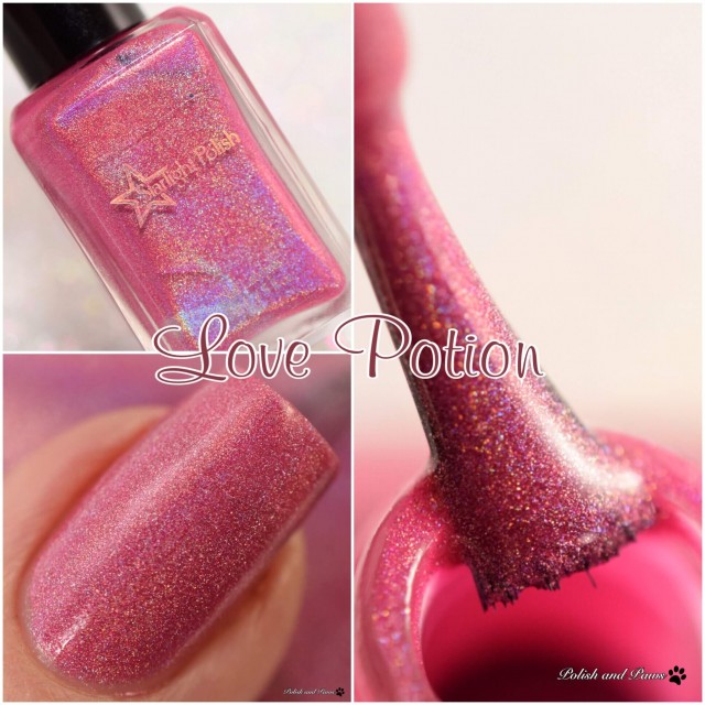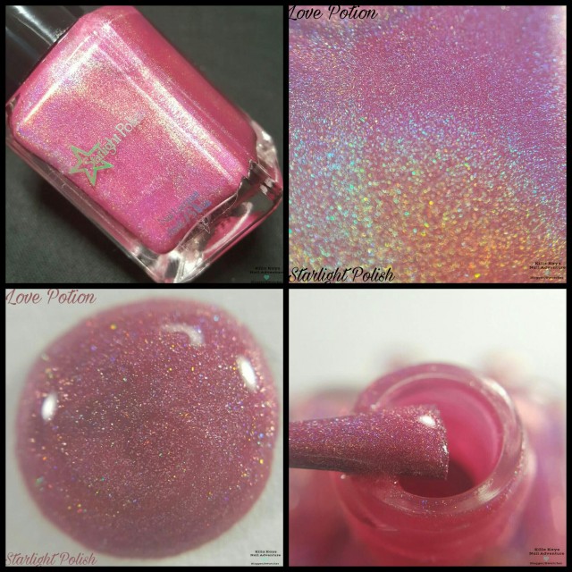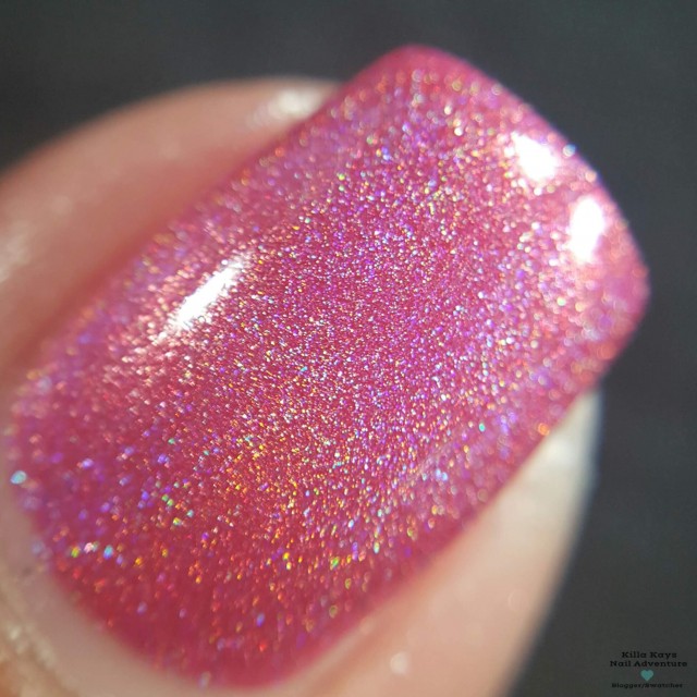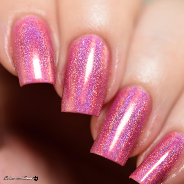 Love Potion is a cool pink holographic polish that leans a bit toward purple, named for the Floribunda rose variety ‘Love Potion,’ which has roses that range from cool pink to mauve to purple. It is opaque in two to three coats.